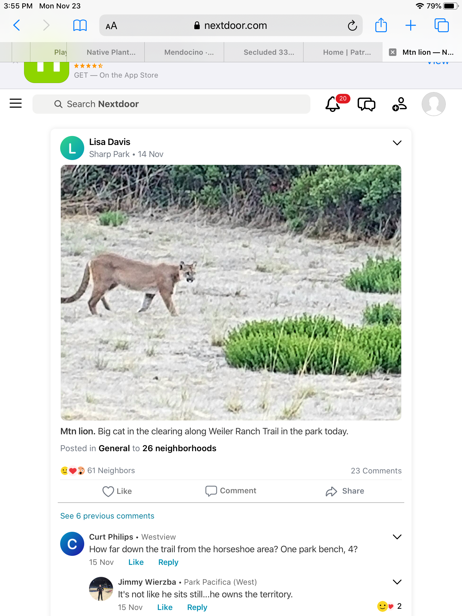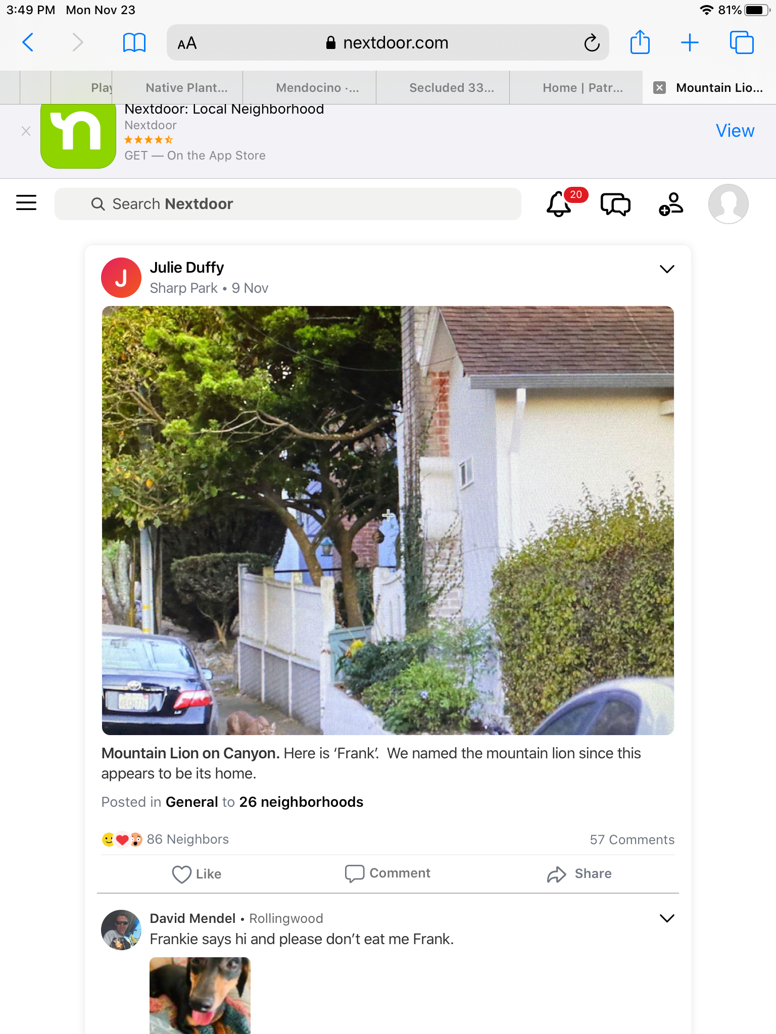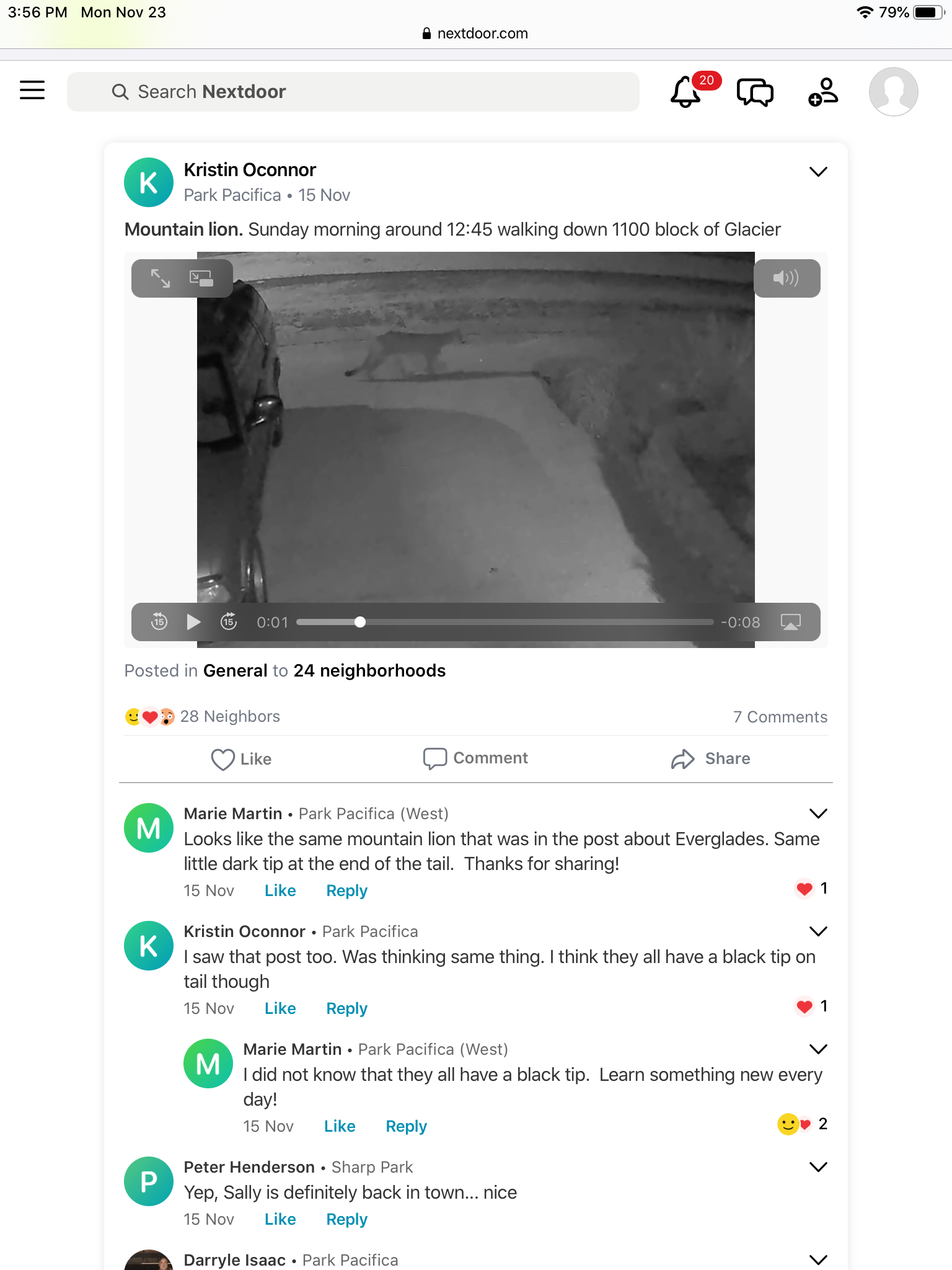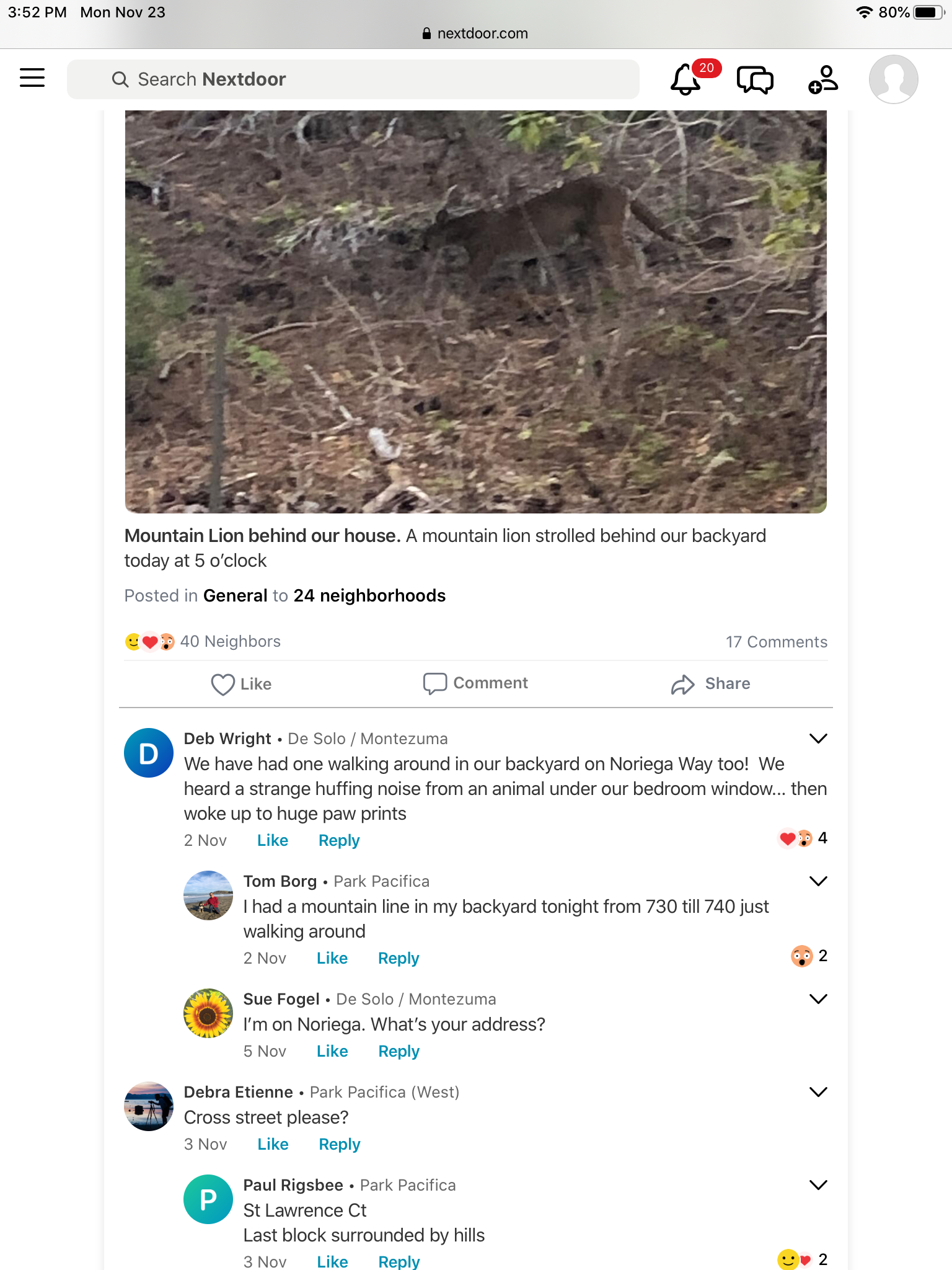 We heard noise on our roof - my husband went outside to see what it was and saw it jump from the roof down into next door neighbor's property, onto their front porch area- their NEST cam saw it hang out there for a couple of minutes. We live on Sterling Ave in Pedro Point.