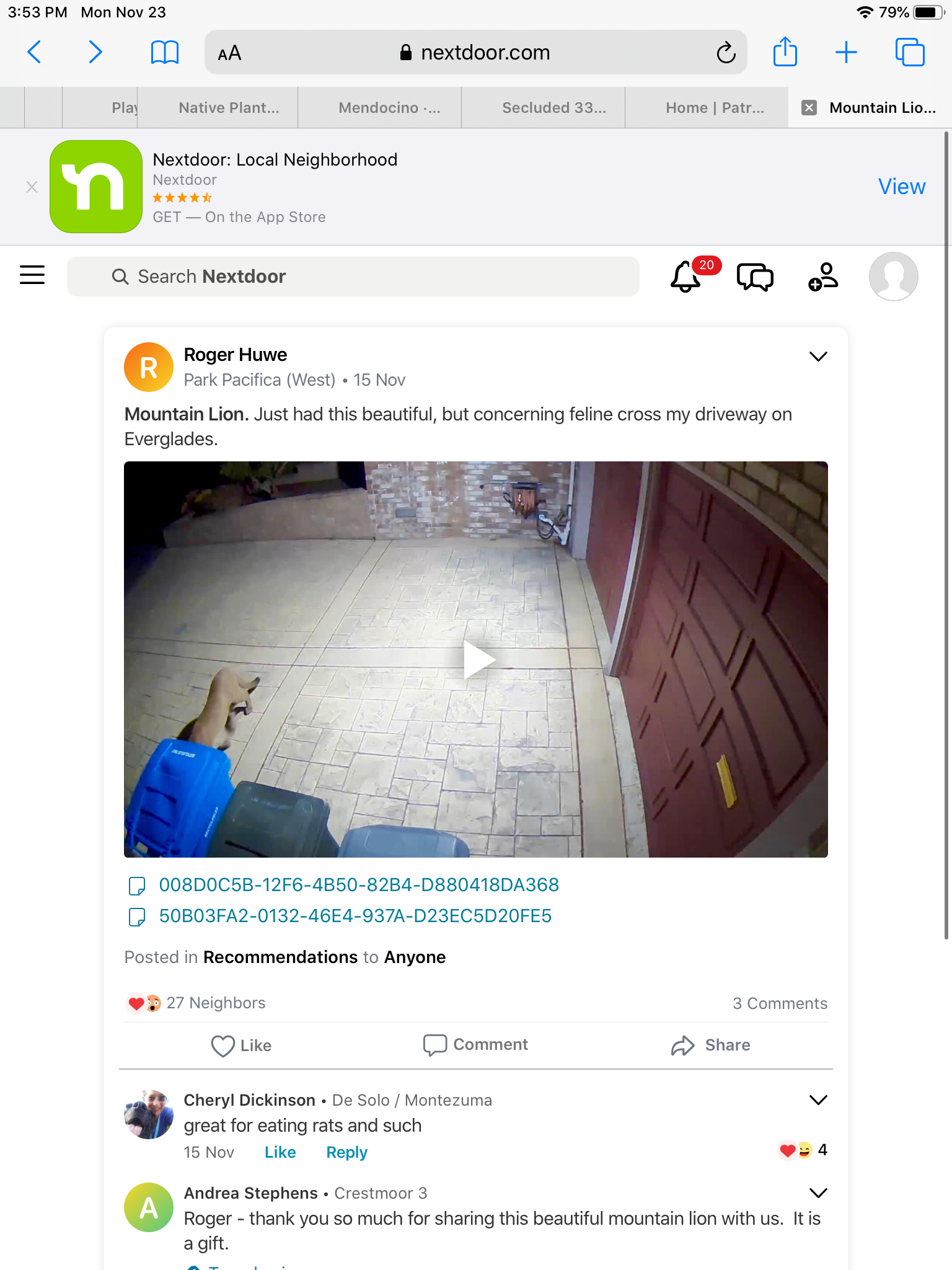 Mountain lion in neighborhood. Daytime. Exact time unknown.