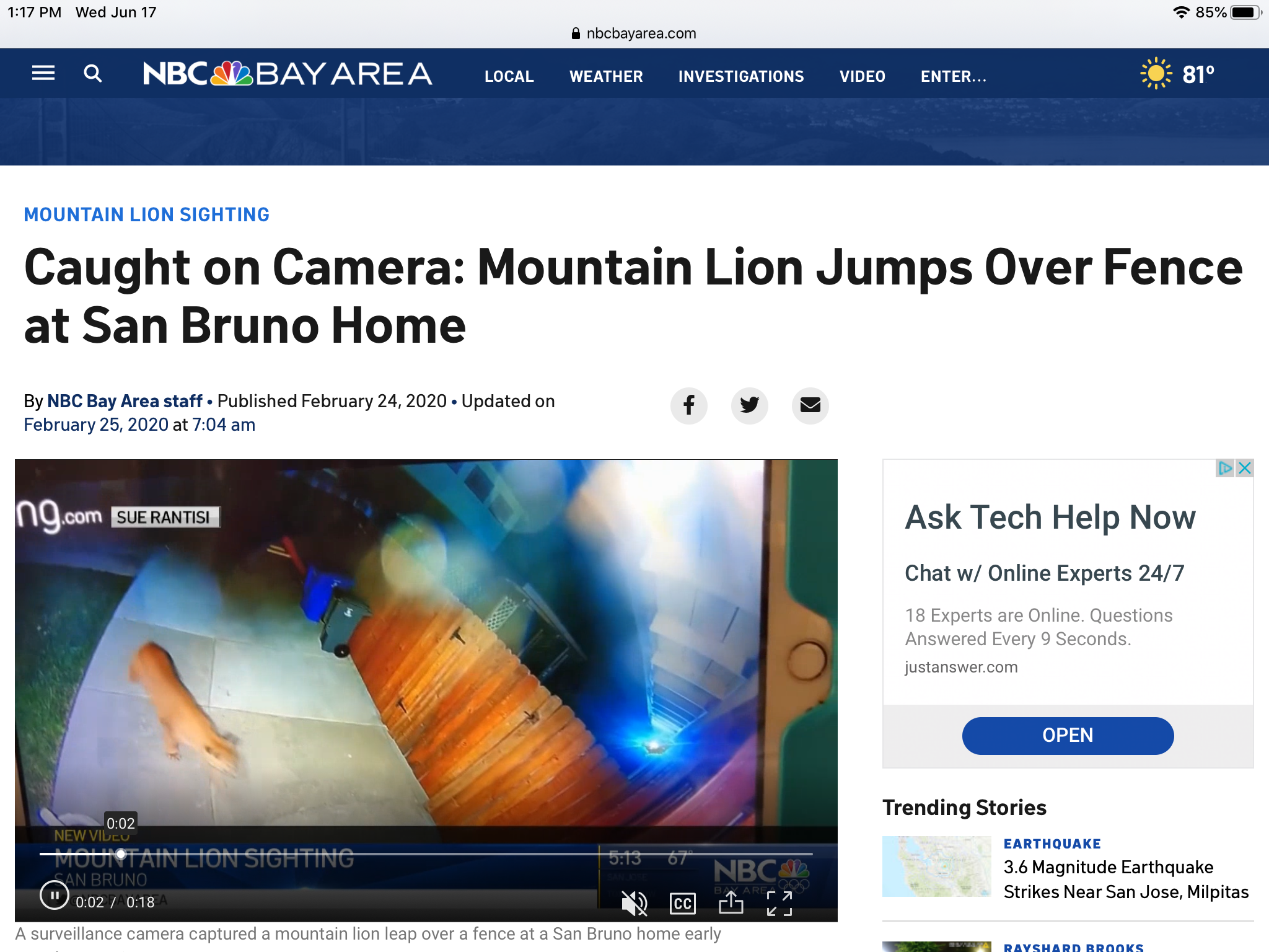 Mountain lion caught on camera jumping over fence in San Bruno home backyard. Time unknown.