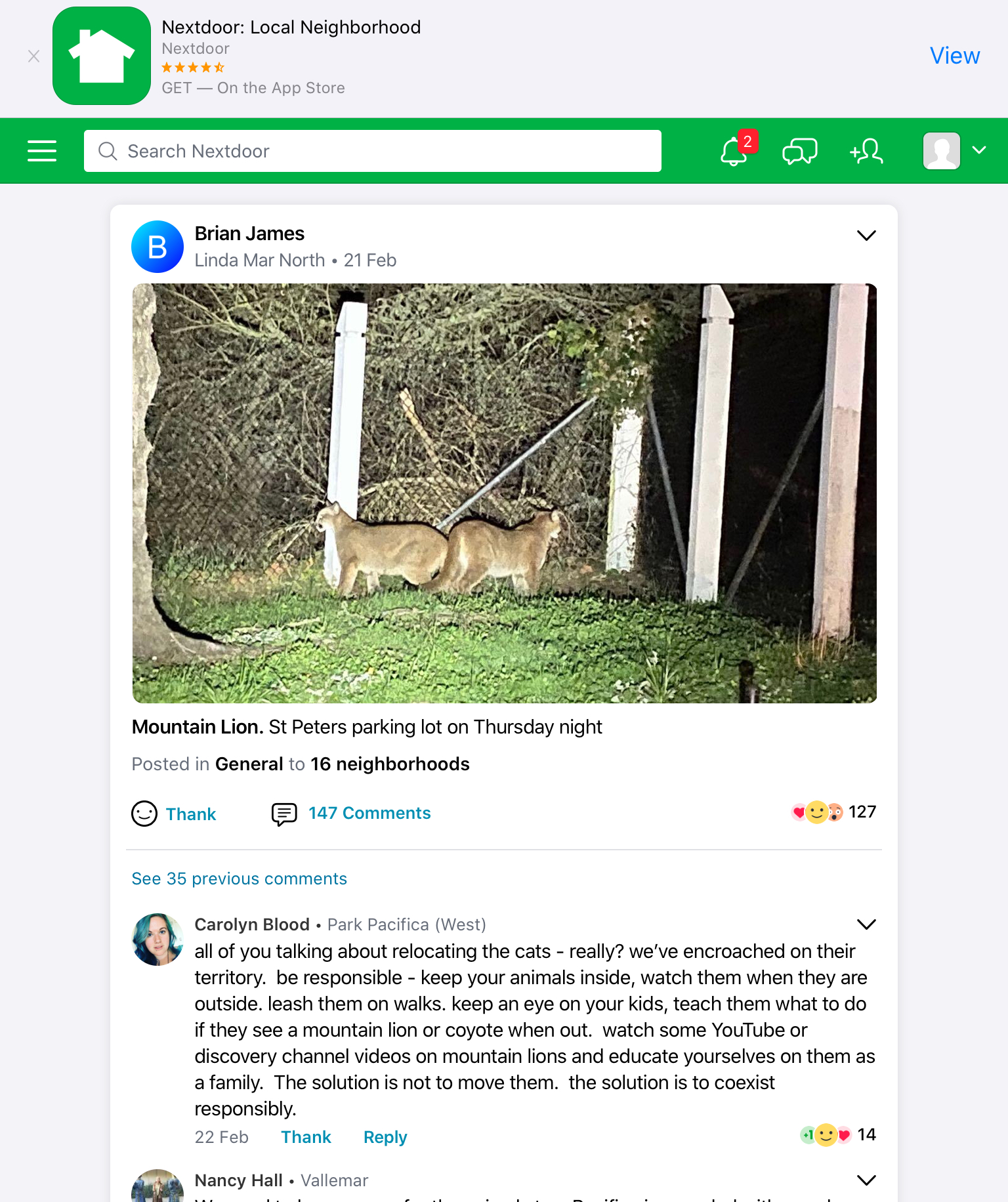 Two mountain lions at St Peter's parking lot on Thursday night. Exact time unknown.