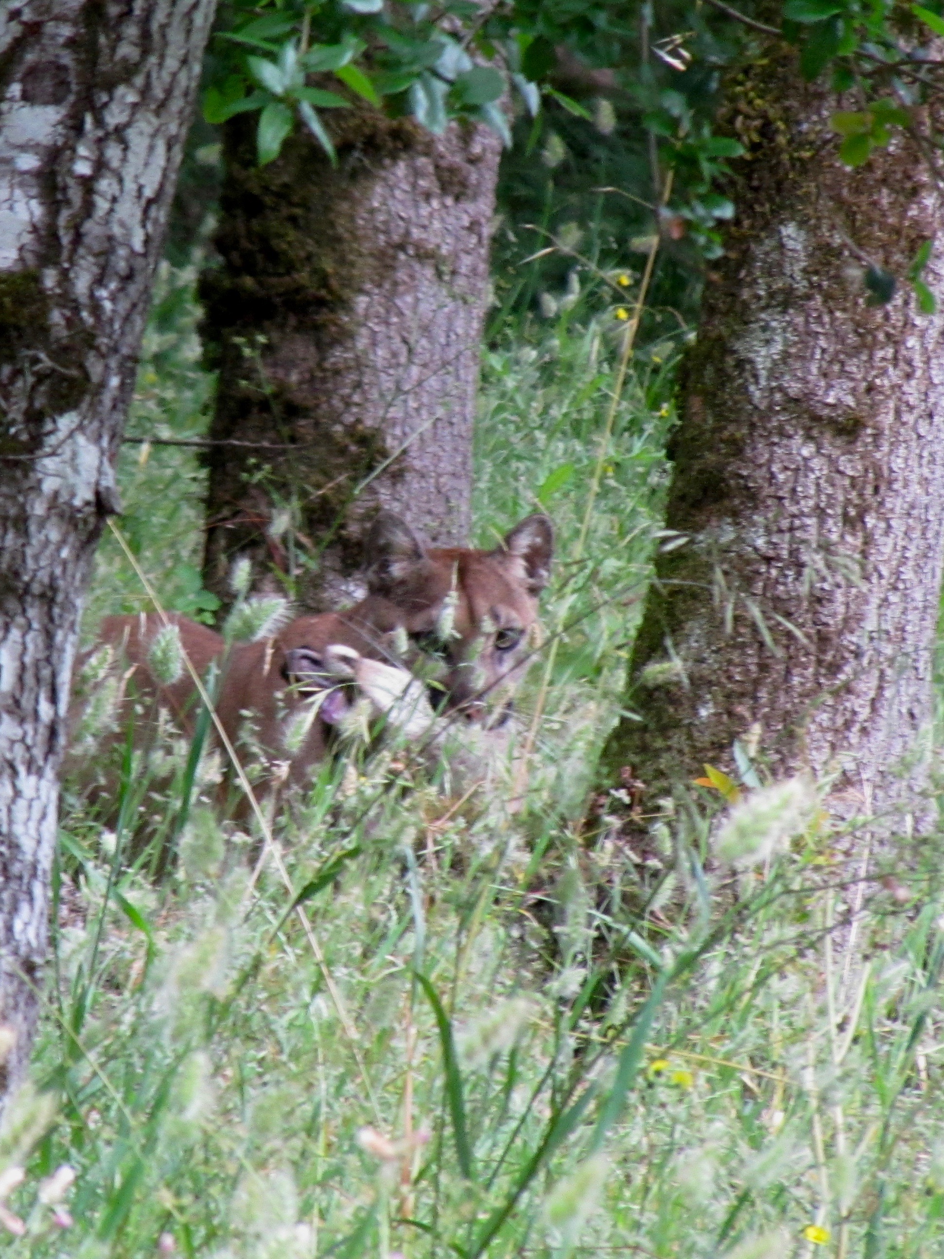 Putting away my animals for the night and one wasn't there. A quick scan I saw her (goat) body in the brush, but didn't see the lion at the time. I approached and as I did the mountain lion took off across the pasture (high dry grass so it blended in). The goat's throat was still wet from where it suffocated her.