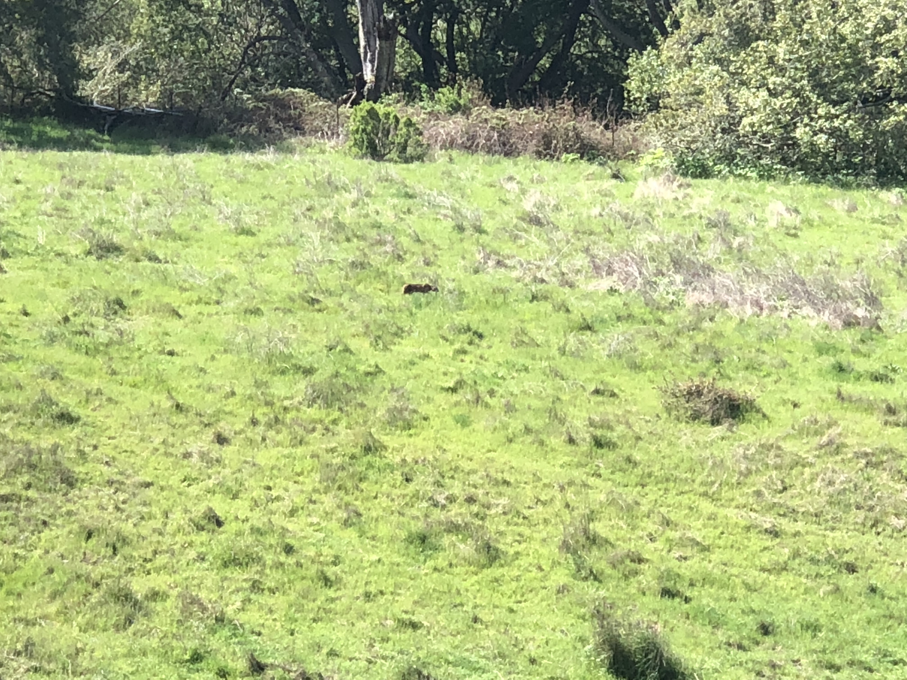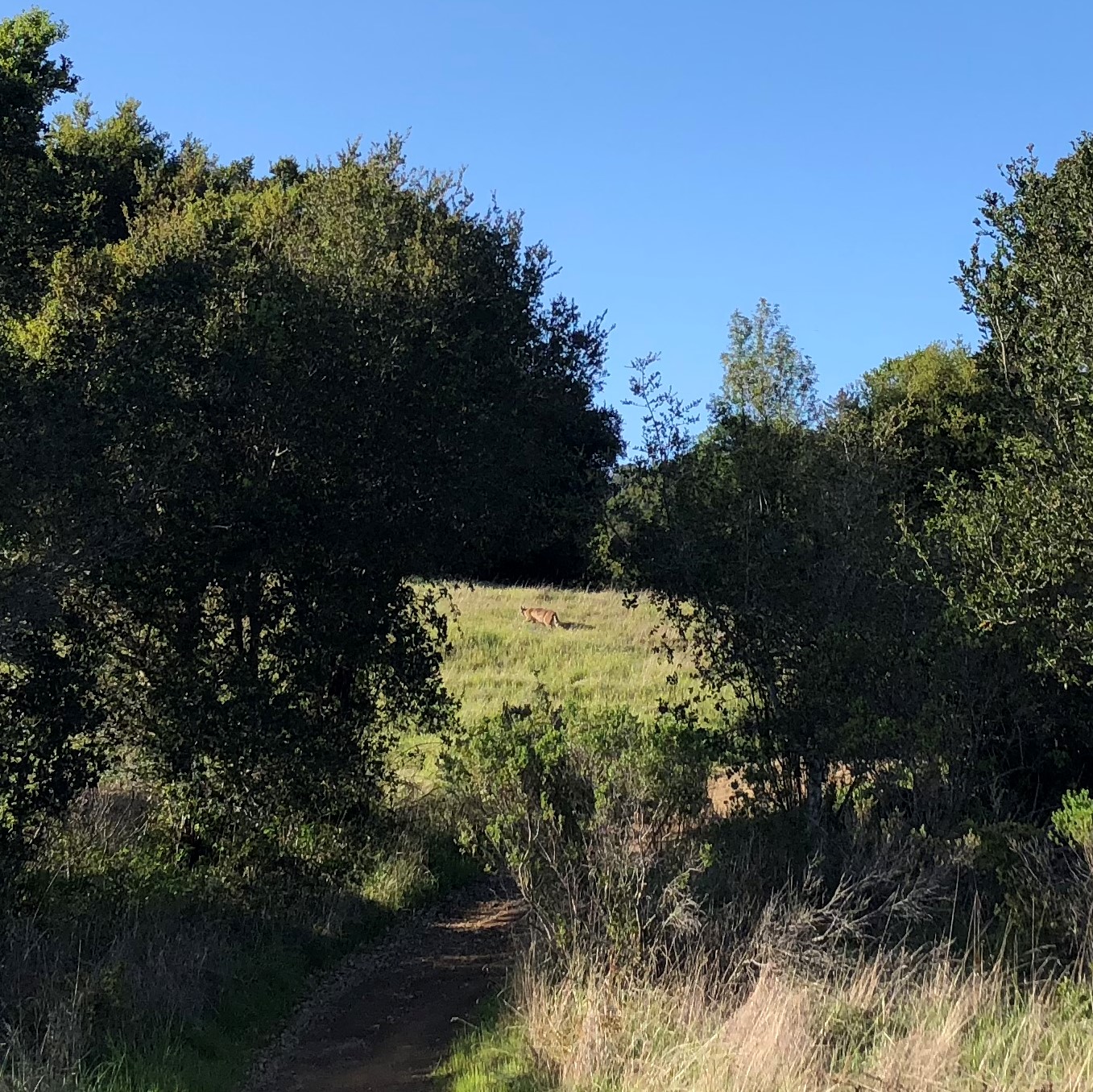 I was riding my bike east from point Reyes to Petaluma on the point Reyes Petaluma road. The mountain lion was stalking in a field to our right by black mountain ranch. I took a photo but it was at a bit of a distance. That said there was no doubt that it was a mountain lion. It appeared to be stealthily moving as if it were stalking, but we did not observe an attempted kill.