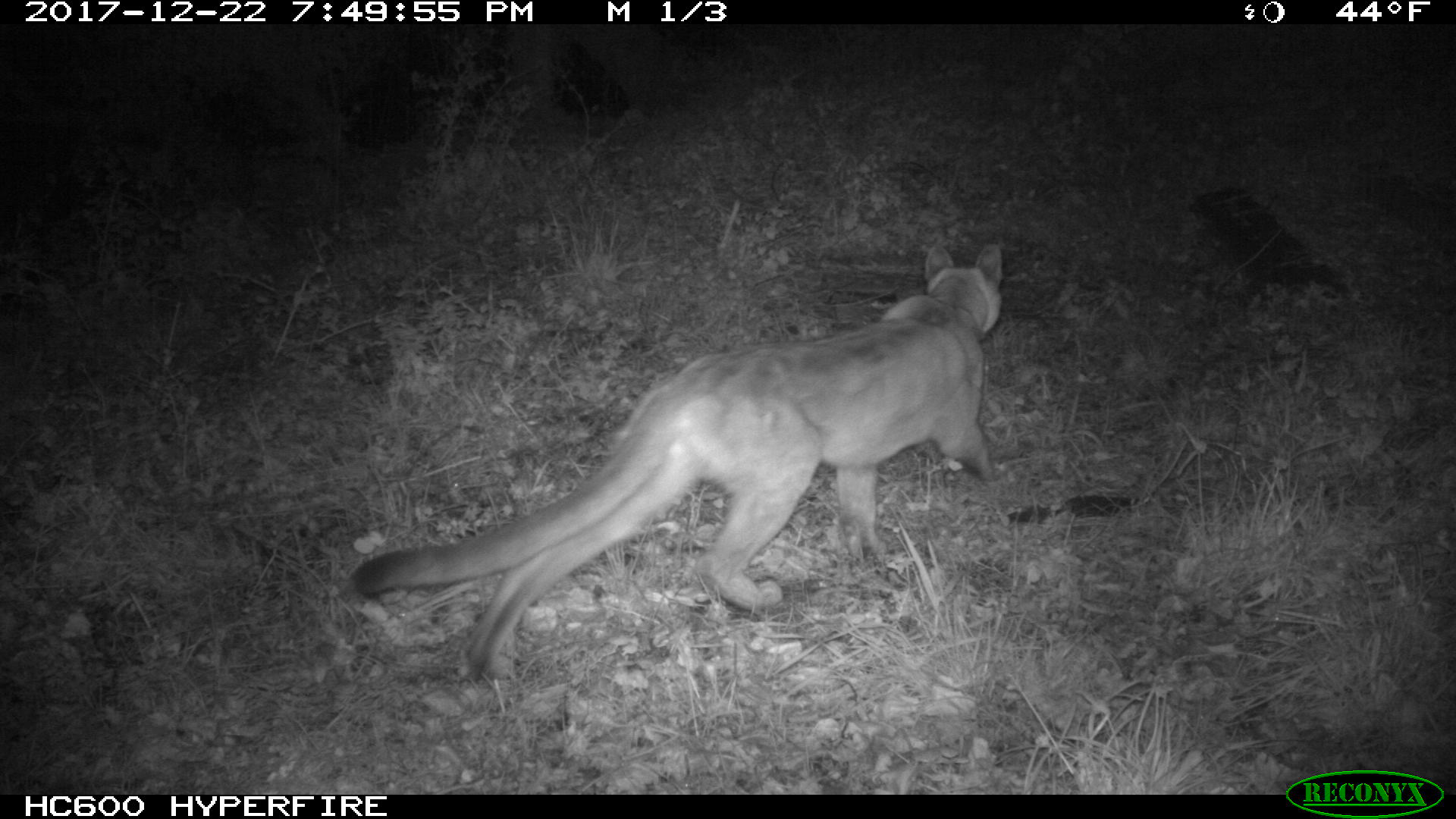 Remote camera at a natural chokepoint for wildlife. Regularly observe bobcat, coyote, skunk, etc, and cougar.