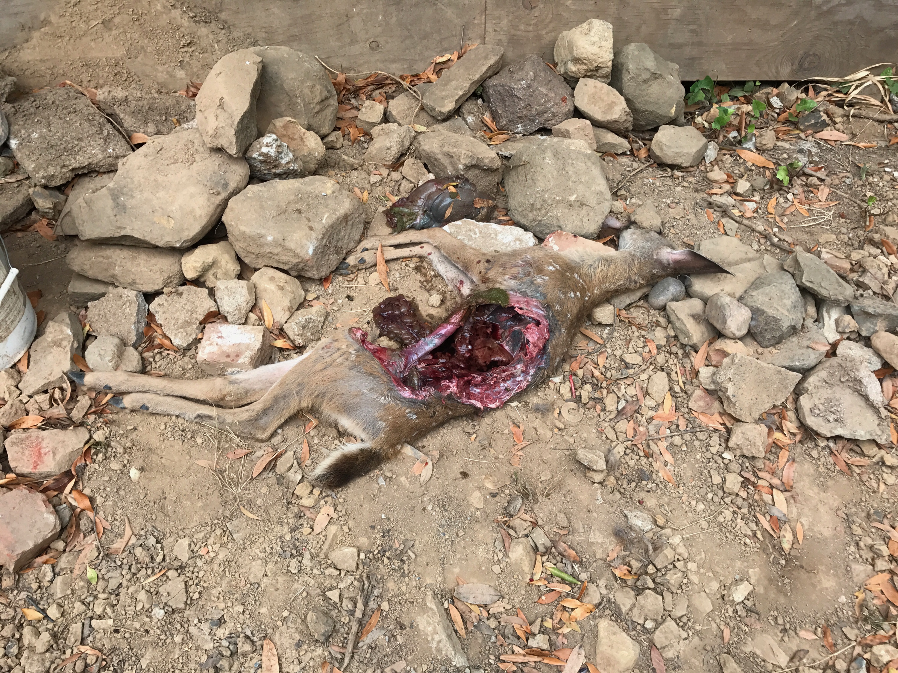 We found a deer in our front yard with a hole in the middle of its body and all of its organs removed. The stomach was on the ground next to the animal. There were also little clumps of hair next to the animal. We live right on West Blithedale (next to the Catholic Church), so very close to downtown!