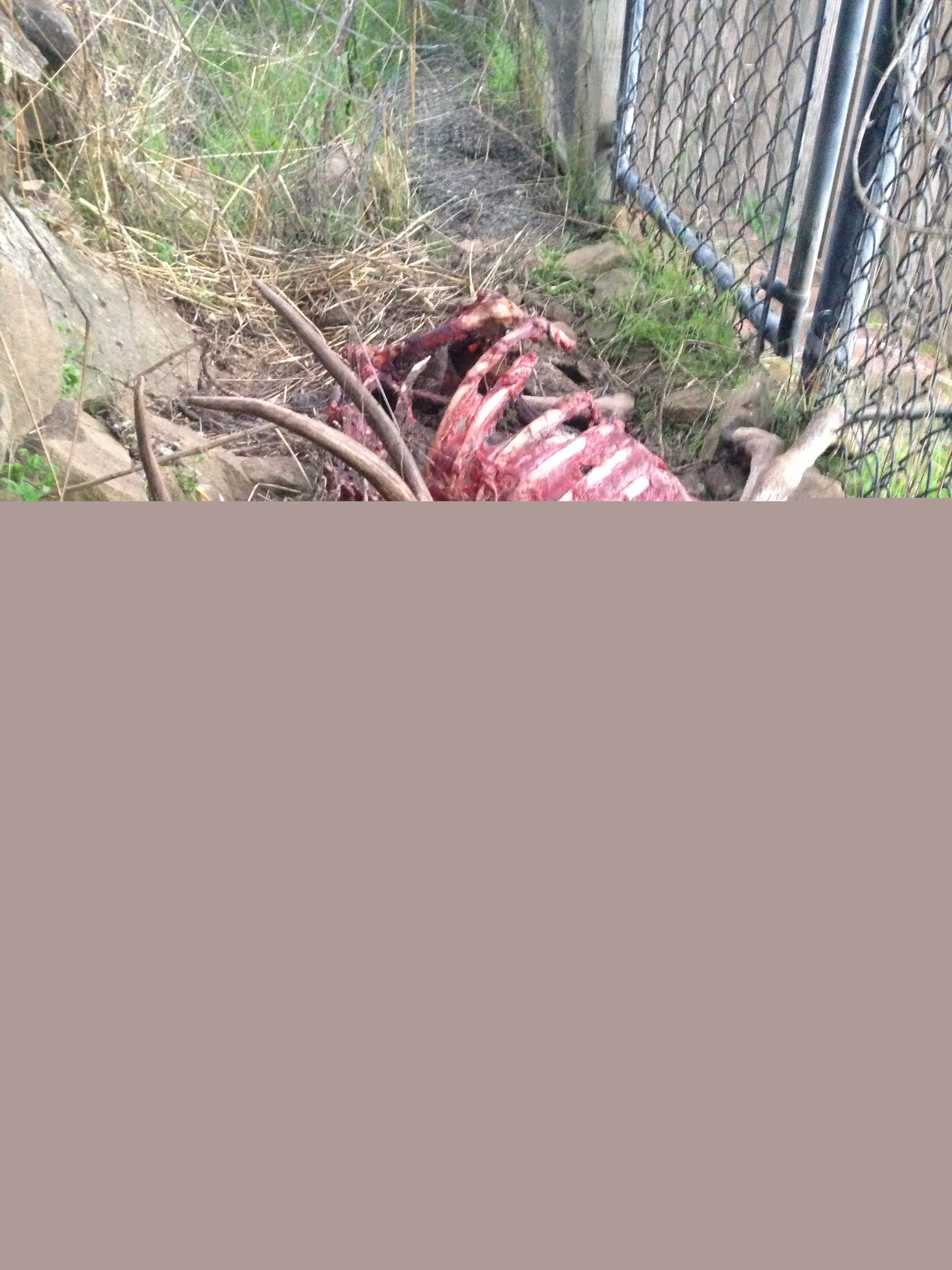 deer carcass found at intersection of fences below very steep hill - easy spot to be cornered - hoof caught in our rear yard fence, but I was working in that area two days prior and didn't see or hear it so I think it was killed - moved the carcass up the hill and what was remaining seemed relatively fresh