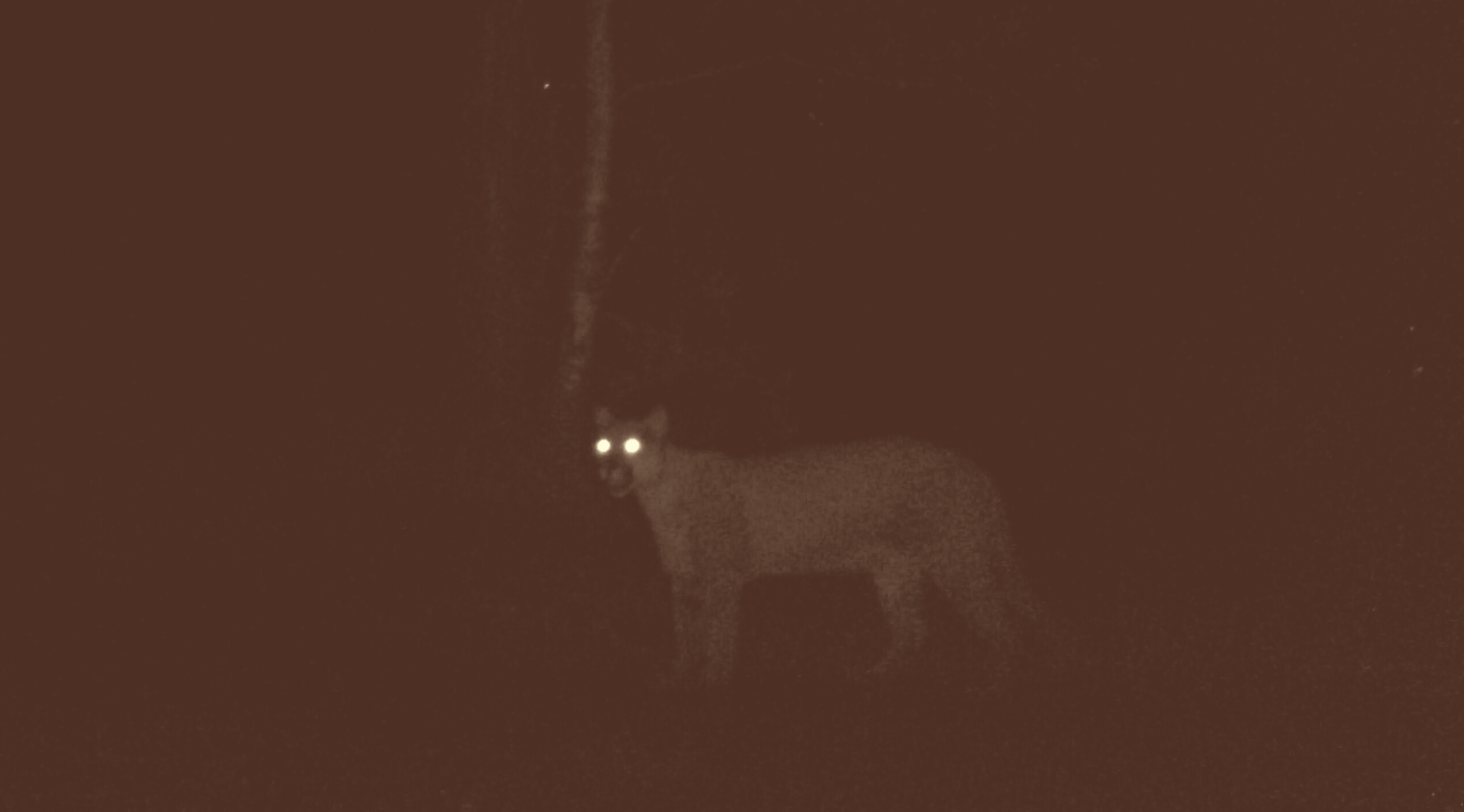 A cougar walked past my front door (which is pane glass) while I was working late at night. He was only visible for the brief moments he was illuminated by our front lights. I did not see him again.