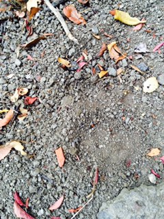 I believe the attached photo shows a Puma print. I saw it Sunday morning on a section of trail in my yard that I had groomed the afternoon before. My boot is there for reference: About 12 1/2" long & 4 1/2" wide at the ball of my foot.