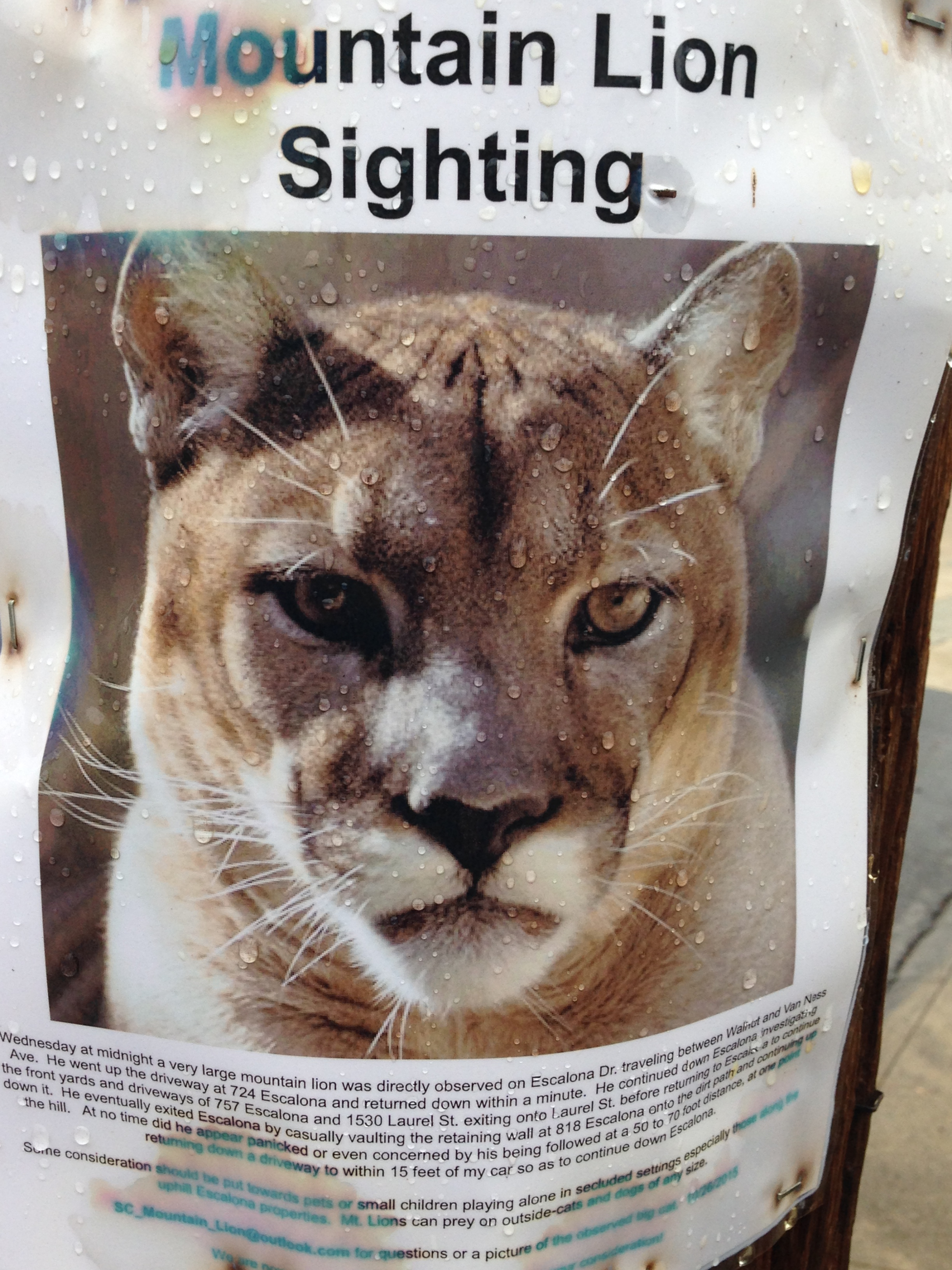 Lion sighted, photo snapped at Escalona Drive and Laurel in Santa Cruz.