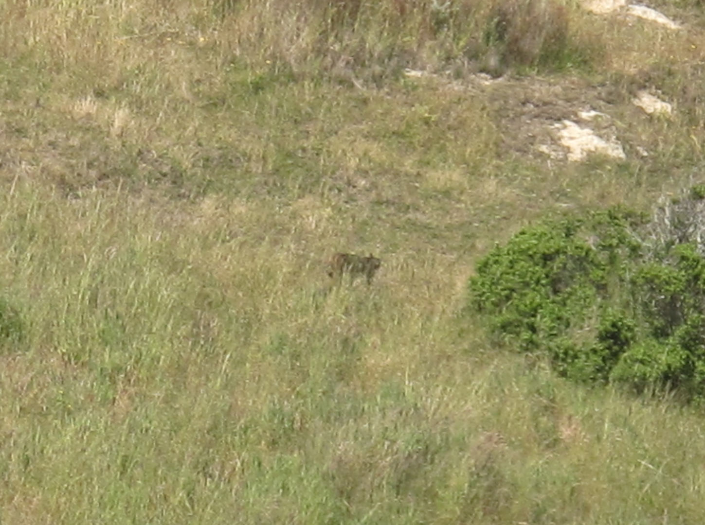 We were driving away from the parking lot at Pierce Point ranch and see the lion on the lawn less than 100 yards away. He was sauntering across the lawn for just a few minutes and then went back into the tall grass to the right. We watched him for about 5 minutes.