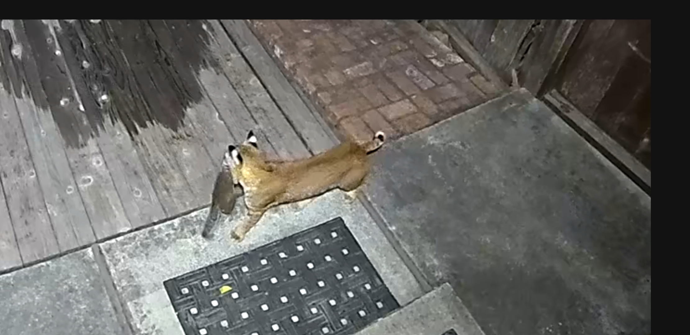 Bobcat carrying it's prey thru my backyard (appears to be a squirrel)